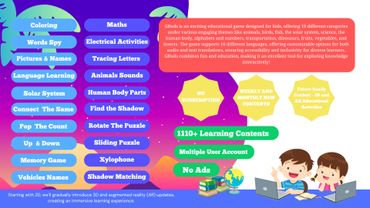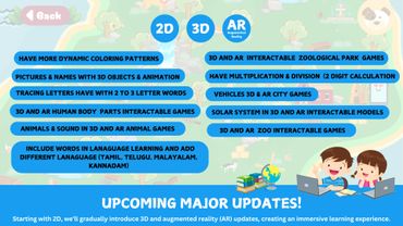 With a one-time purchase, you get access to all of the above features. Initially, the game starts as a multi-category 2D activity game, then evolves into a 3D game featuring animals and birds. As it continues to update, it introduces AR and multiplayer capabilities, all designed specifically for your kids to enjoy. Plus, we’re adding VR experiences to make learning even more immersive!